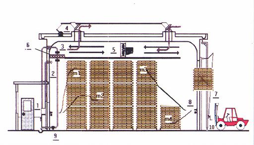 頂風機型干燥窯屬周期式強制循環(huán)干燥窯,風機置于干燥窯頂部,采用耐高溫、高濕電機和防腐鋁壓鑄葉輪組裝在風機架上,并按氣流方向分為正壓區(qū)和負壓區(qū)。風機可正逆定時換向旋轉(zhuǎn),氣流隨之改變循環(huán)方向,以此實現(xiàn)了通過材堆的氣流分布均勻而獲得很好的干燥質(zhì)量。
